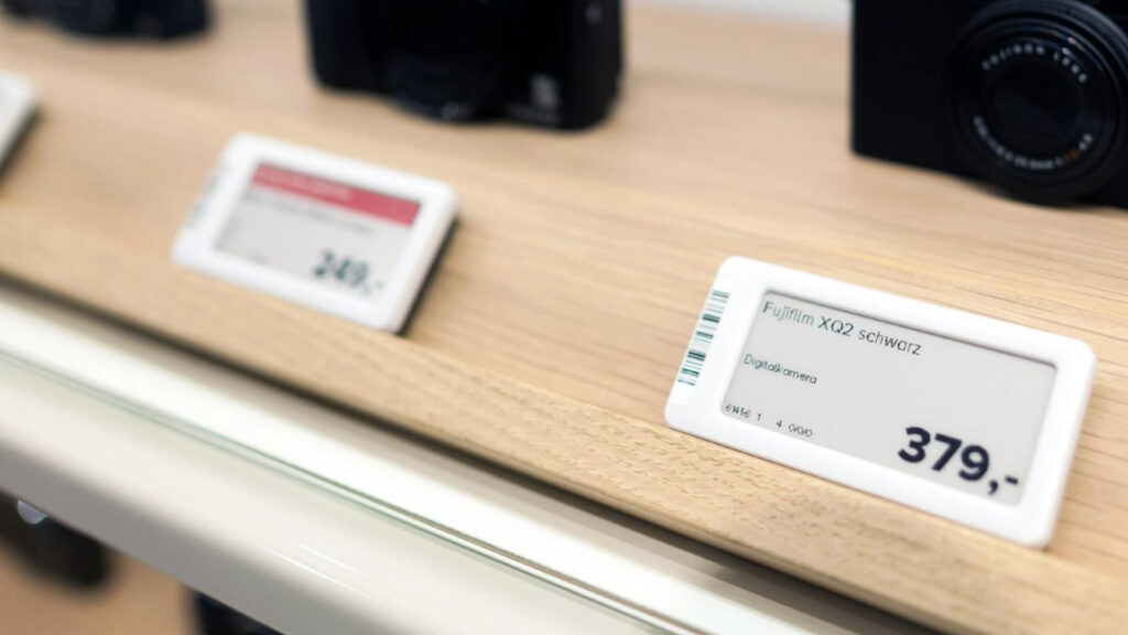 Colour indications can also be implemented on request: for example, sale prices can appear in red on the electronic shelf labels. Foto Koch uses this feature to draw attention to ‘cashback’ promotions or to indicate that the item is sold with a free gift. In the glass showcases of the Düsseldorf shop, the business card-sized price labels are definitely eye-catchers. Foto Koch opted for this Breece format because it is best suited to the advertising concept of the specialist retailer. But other sizes and layouts are available too.