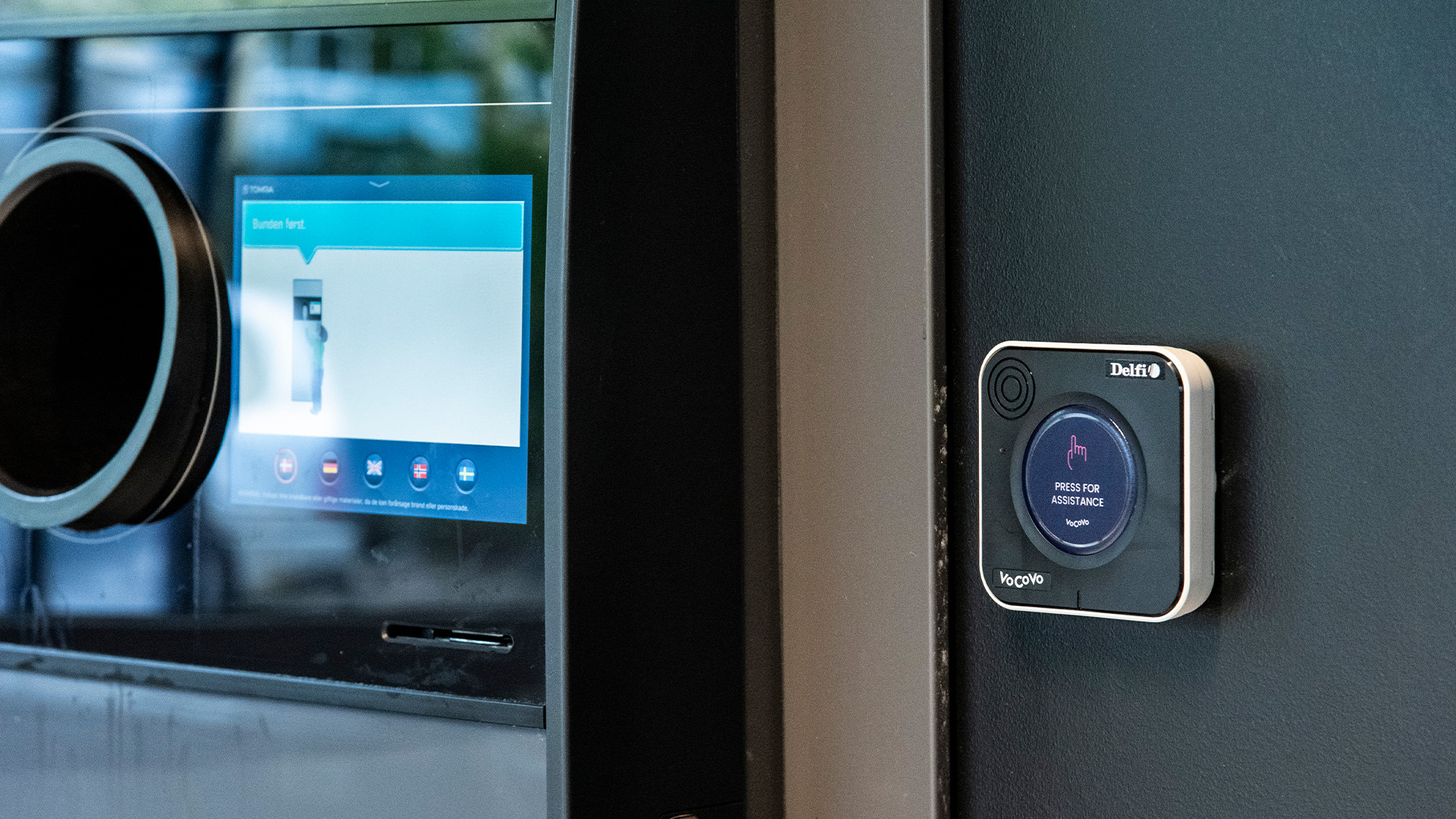 Ved lagerindgangen er der installeret en kaldeknap, så kunder og leverandører nemt kan tilkalde hjælp. Beskeden går direkte ud i headsets – og en medarbejder kan straks rykke ud.