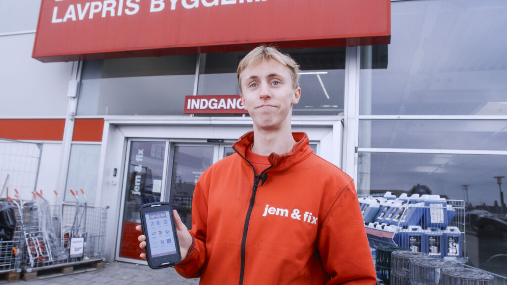 – “Hvis en kunde kommer inn og spør etter en bestemt vare, men hyllen er tom, går jeg bare ned og skanner den, og så ser jeg at det finnes noen på pall 1001 – så går jeg ut og henter den til kunden”, sier Oliver Jonas Arnbo, ansatt hos jem & fix i Tårnby.